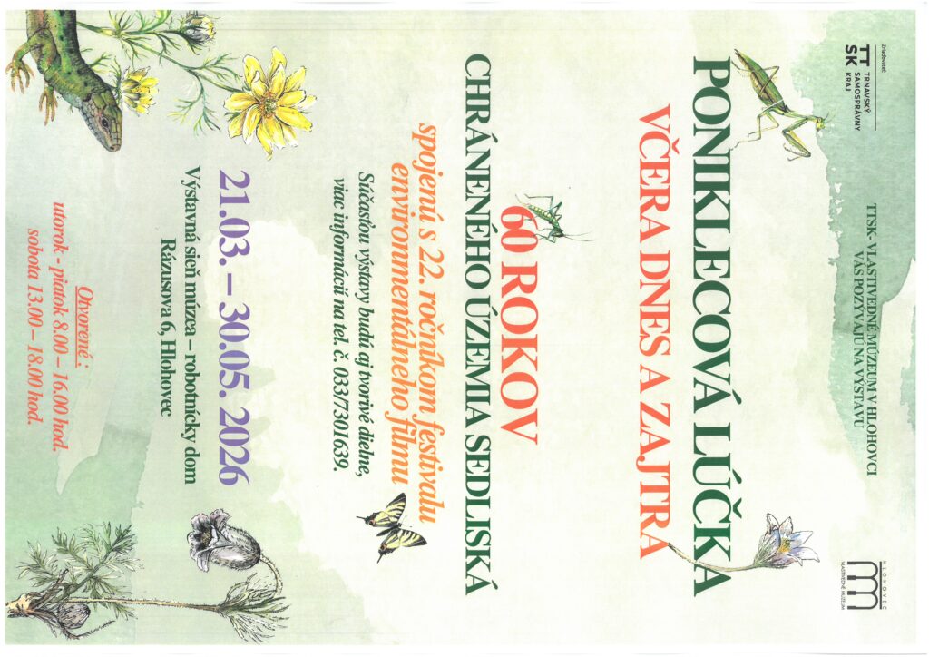 TTSK a Vlastivedné múzeum v Hlohovci pozývame návštevníkov múzea na výstavu Poniklecová lúčka včera, dnes a zajtra – 60 rokov chráneného územia Sedliská spojenú s 22. ročníkom festivalu environmentálneho filmu. Súčasťou výstavy budú aj tvorivé dielne, na ktoré sa môžete objednať telefonicky 033/7301639.