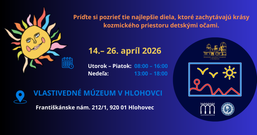 Slávnostná vernisáž výstavy “Vesmír očami detí 2026” s odovzdaním diplomov a cien pre autorov postupujúcich prác do celoslovenského kola sa uskutoční v piatok, 17. apríla, od 10:00.